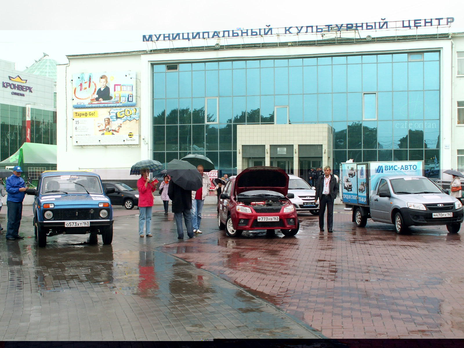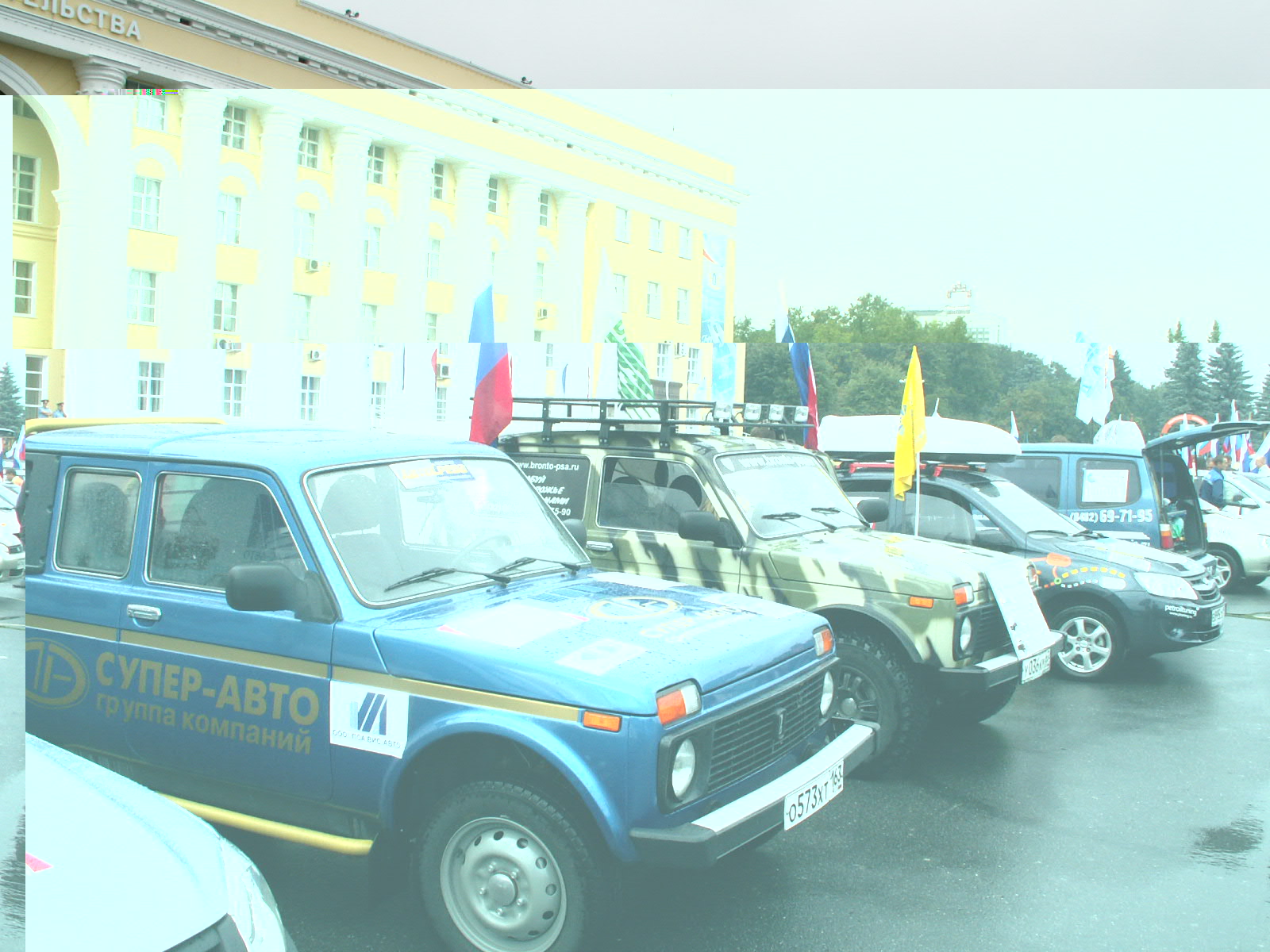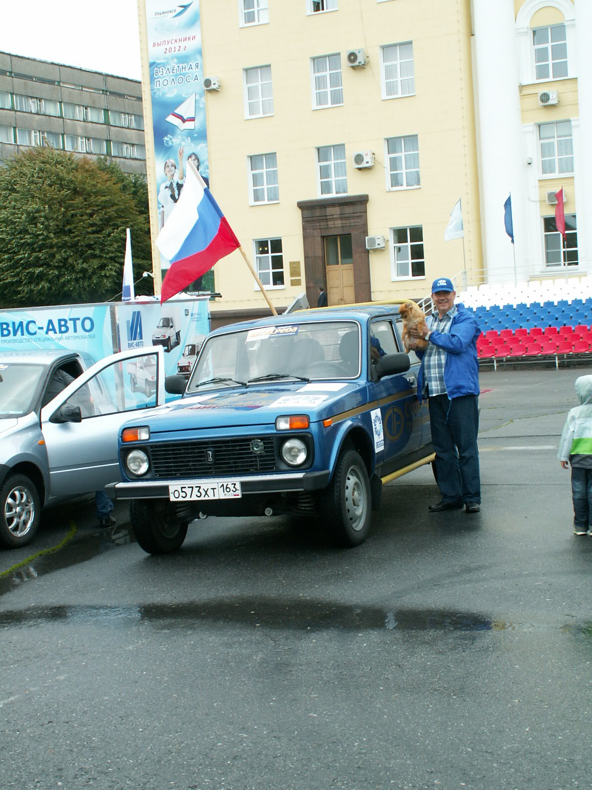 21 июля, во время торжественного мероприятия возле Научно-технического центра ВАЗа погода была просто замечательная! Но затем ночью начался дождь и утром 22-го мы стартовали на Ульяновск по дождю. Пока мы были у дилера ВАЗа - "Симбирск-Лада", дождь вроде-бы прекратился. Но как только мы выехали к месту первого шоу в Заволжском районе, начался настоящий ливень. А туда подъехали ещё и представители УАЗа на различных версиях "Патриотов", однако из-за сильного дождя мероприятие было скомкано